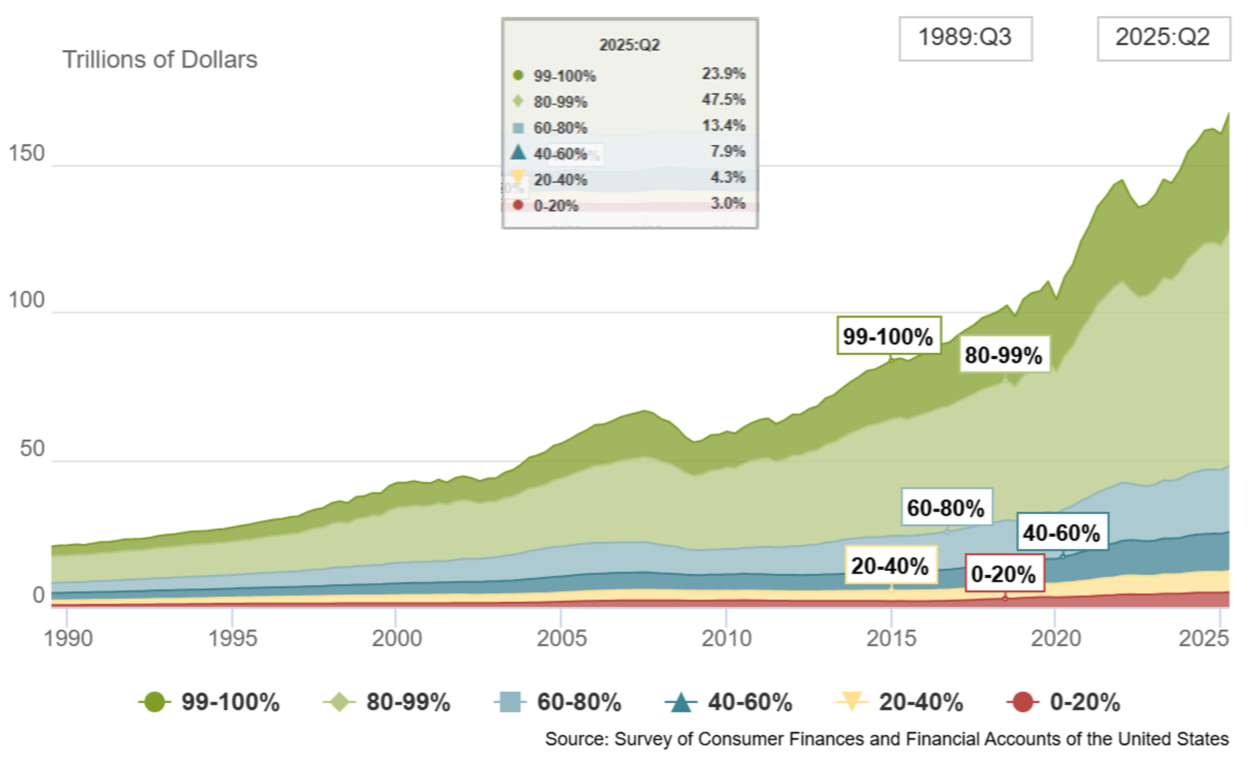Source: Distribution of Household Wealth in the U.S. since 1989, https://www.federalreserve.gov/releases/z1/dataviz/dfa/distribute/chart/#quarter:142;series:Net%20worth;demographic:income;population:1,3,5,7,9,11;units:levels;range:1989.3,2025.2